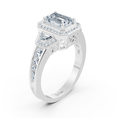 Dieser eindrucksvolle Ring aus 14-karätigem Weißgold vereint verschiedene Schliffarten in einem luxuriösen Design. Im Zentrum steht ein großer Weißtopas im Emerald-Schliff, flankiert von zwei Baguette-Schliffen und umgeben von funkelnden, laborgezüchteten Diamanten. Die harmonische Komposition aus Formen und Proportionen sorgt für ein raffiniertes Funkeln und eine extravagante Ausstrahlung. Ideal für besondere Momente oder als unvergessliches Verlobungsgeschenk.