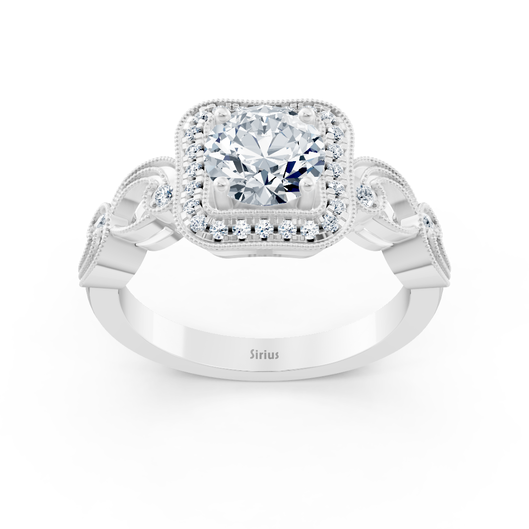 Dieser edle Ring aus 14K Weißgold besticht durch seine detailverliebte Ornamentik und die Kombination aus funkelnden laborgezüchteten Diamanten und einem zarten Weißtopas im Zentrum. Ein stilvoller Verlobungsring mit femininer Eleganz.