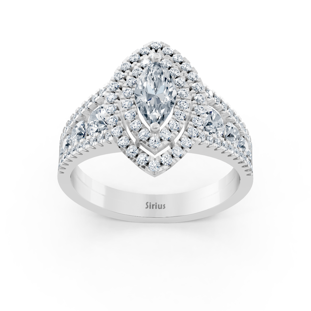 Cette bague pour femme époustouflante en or blanc 14 carats combine un centre marquise dramatique avec un double halo scintillant et des pierres latérales finement serties en diamants cultivés en laboratoire et topaze blanche. La réflexion facettée de la lumière assure une apparence luxueuse en toute occasion.
