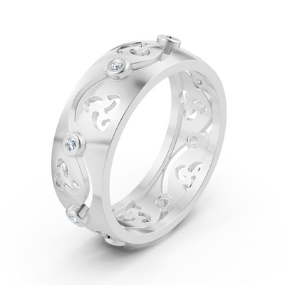 Dieser Ring kombiniert moderne Eleganz mit verspieltem Design. Aus 14 Karat Weißgold gefertigt und mit elf laborgezüchteten Diamanten verziert, besticht er durch ein zartes Rankenmuster und eine sichere Bezel-Fassung. Ideal für alle, die auf der Suche nach einem stilvollen und nachhaltigen Schmuckstück sind.